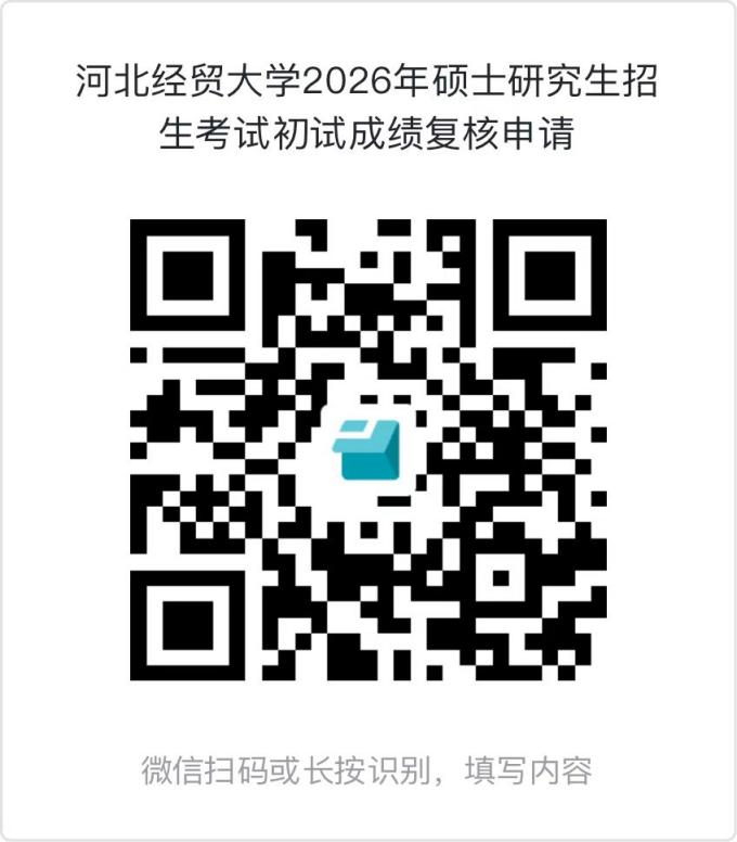 2.微信扫描下方二维码,准确、完整填报考生编号(15位数字)、考生姓名、身份证号、复核科目、已查知成绩、申请复核理由、联系电话等相关信息,并按要求上传《2026年全国硕士研究生招生考试成绩复核申请表》等附件后提交。