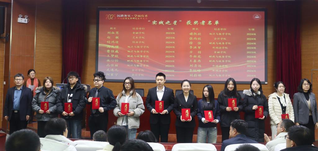 张健宣读了《关于表彰河北经贸大学2025年研究生“学术之星”、“实践之星”的决定》。本届共评选出“学术之星”与“实践之星”各20名,“学术之星”和“实践之星”获奖代表分别发言,分享了学术探索与实践创新中的心得体会与成长感悟。